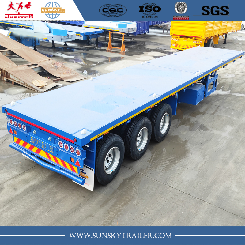 Sunsky produces the high quality 3 Axles 40 feet Flatbed Trailer for carrying 40 feet container (2 x 20ft container) and bulk cargo. The 40 feet flatbed trailer payload about 40 ton . The 3 axles 40 feet flatbed trailer also called tri-axle flat deck trailer. Sunsky trailer are focus on high quality products, flatbed trailers can be changed into different configuration and custom-built as your requirement.
